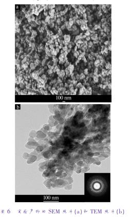 圖6分別為實(shí)驗(yàn)產(chǎn)物的SEM和TEM照片。由圖6a可以看到,粉末為均勻的粒狀產(chǎn)品,無(wú)塊狀產(chǎn)物出現(xiàn)。從圖6b可見(jiàn),產(chǎn)物為粒狀顆粒,大小尺寸均小于100nm,其SAED圖可看到多個(gè)同心圓的衍射環(huán),說(shuō)明納米磷酸鋅是一結(jié)晶性良好的多晶結(jié)構(gòu)。
