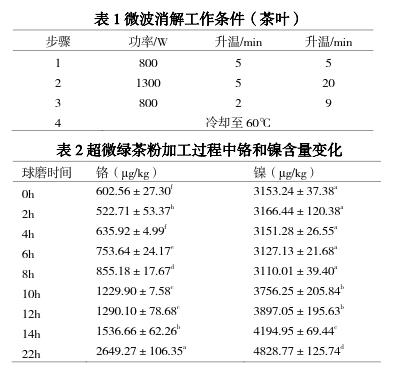 血[6];過量的鎳可引起炎癥、癌癥、癥、系統(tǒng)紊亂、降低生育能力、致畸和致突變等[7];鉻雖是人體必需的微量元素,但高鉻的食用也會引起不適[8]。超微綠茶粉是將達到綠色標準的綠茶茶葉,經(jīng)超微粉碎形成 200 目(74μm)甚至達到 1000 目(12μm)以上的綠茶超微細粉[9-10]。現(xiàn)階段我國企業(yè)大多采用球磨方式加工超微綠茶粉,在球磨加工過程中,茶葉被粉碎的同時,研磨材料本身也會發(fā)生變化,從而可能給超微綠茶粉帶來重金屬污染。另外,與傳統(tǒng)茶葉不同的是,超微綠茶粉屬于茶葉深加工范疇,常被以全組分形式加入到食品和化妝品中[11],又因其中的重金屬元素應(yīng)滿足《食品標準食品中污染物限量》和《茶葉中鉻、鎘、汞、砷及氟化物限量》對茶葉中重金屬限量要求[12-13],因此應(yīng)對超微綠茶粉加工過程中重金屬污染給予關(guān)注,但目前對超微綠茶粉加工過程中的重金屬含量變化未見報道。本文對球磨加工過程中超微綠茶粉的重金屬含量進行檢測分析,同時,采用三組球磨材料不銹鋼球-不銹鋼罐、氧化鋯球-不銹鋼罐、瑪瑙球-尼龍罐對超微綠茶粉進行加工,通過重金屬元素鉻和鎳的檢測,并結(jié)合粒徑分析,為尋找合適的球磨材料提供依據(jù)。