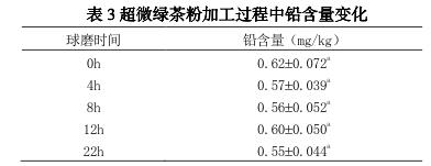 超微綠茶粉中的鉛并無顯著差異。原因為在球磨加工過程中,茶樣處于密閉空間中,且所接觸的球磨材料中鉛,所以在超微綠茶粉的加工過程中,并不會造成鉛污染。