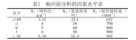 影響球磨機超微粉碎效果的主要因素有球料比、攪拌器轉(zhuǎn)速、枸杞子渣漿液濃度和粉碎介質(zhì)。因此本研究以上述3個因素作為試驗因素,固定球磨介質(zhì)為Φ10mm氧化鋯球,在單因素試驗的基礎上,通過響應面分析化佳工藝參數(shù),以粉碎后的顆粒粒度d50作為超微粉碎評價效果。