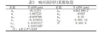 從表3看出:方程的相關系數(shù)R2值達到了0.8838,表明方程的自變量和因變量之間的回歸效果顯著,可用于對試驗進行分析。二次項中球料比、枸杞子渣漿液濃度和攪拌器轉(zhuǎn)速對顆粒的d50影響效果為顯著(p<0.05)。由圖1可得出佳超微粉碎工藝條件為:球料比5,枸杞子渣漿液濃度40%,攪拌器轉(zhuǎn)速800r/min。在此佳工藝條件下顆粒d50為18.2µm