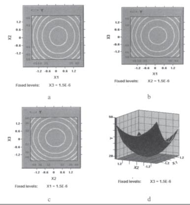 利用響應面分析法[1]化枸杞子渣超微粉碎工藝參數(shù)。在單因素預試驗基礎上,用SAS軟件系統(tǒng)進行響應面分析,設計一個三因素五水平的回歸方程來擬合因素和指標(響應值)之間的函數(shù)關系。選擇球料比(X1)、枸杞子渣漿液濃度(X2)和攪拌器轉(zhuǎn)速(X3)作為因素,以粉碎后的顆粒粒度d50作為響應值對球磨機濕法超微粉碎工藝進行化。